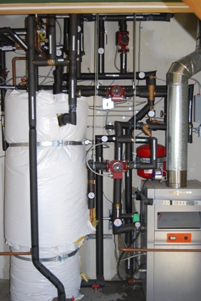 The mechanical room utilizes low tech, long lasting equipment with high tech controls. The boiler is a bullet proof Canadian made cast iron unit, the 80 gallon hot water tank is stainless steel.