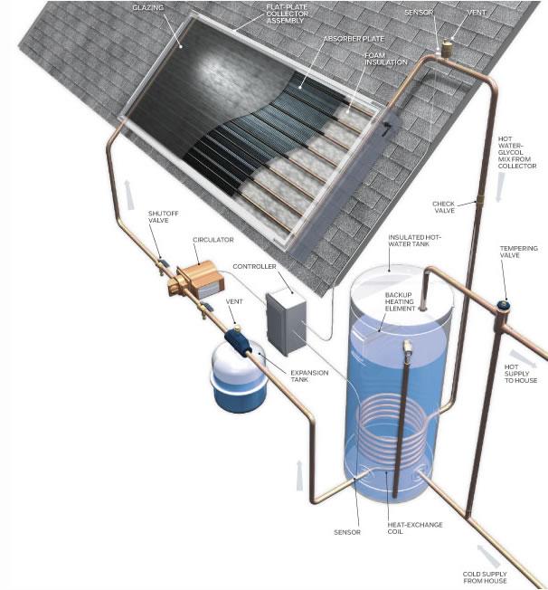 In Caliornia most homes will benefit from an "Active" or "Open Loop" solar water heating system. This means that cold water is pulled out of your tank and passed through your solar panel on your roof and is heated and pushed back into your tank.